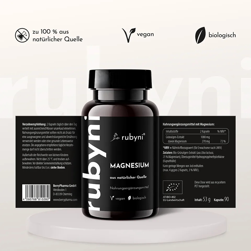 rubyni® Magnesium ist ein Nahrungsergänzungsmittel, das natürliches Magnesium in Form von purem Bio-Grünalgen-Extrakt enthält.