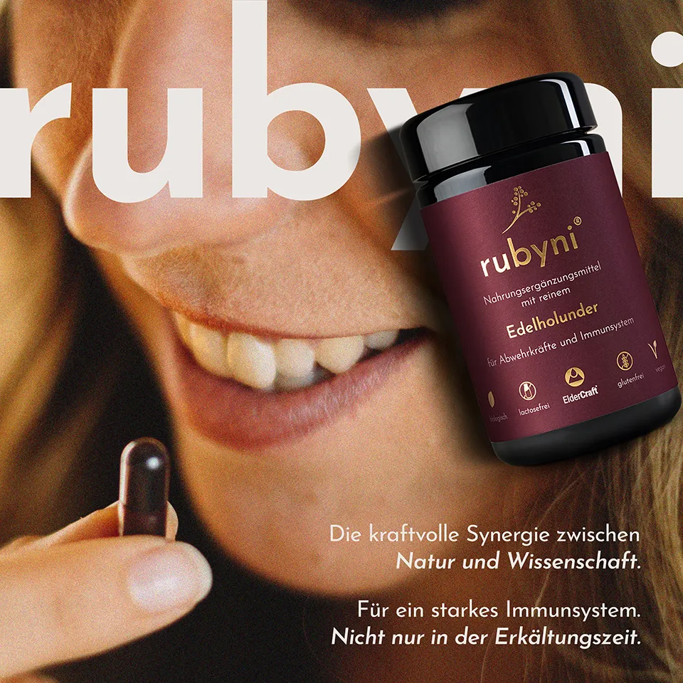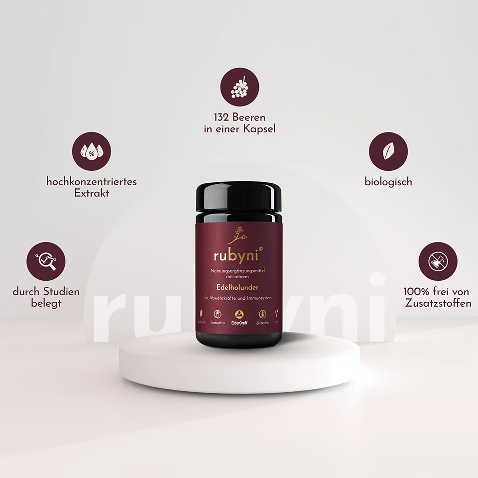 Das Immunsystem erfüllt eine Vielzahl wichtiger Aufgaben für unseren Körper. Und Sie können es tatkräftig durch eine gesunde, nachhaltige Ernährung unterstützen. Dabei leisten bereits 1–2 Kapseln rubyni® Edelholunder täglich einen zusätzlichen Beitrag im Rahmen Ihrer Ernährung – die Nahrungsergänzung für optimale Abwehrkräfte. rubyni® Edelholunder enthält 100% ElderCraft®, ein hochkonzentriertes und hochqualitatives Trockenextrakt aus den Schwarzen Edelholunderbeeren der Sorte Haschberg. Eine einzige Kapsel enthält die Kraft von mindestens 132 Beeren. rubyni® Edelholunder ist ein rein biologisches (AT-BIO-402 EU-Landwirtschaft) Produkt ohne Füllstoffe wie z.B. Maltodextrin und wird sehr sorgsam durch eine spezielle und einzigartige Form der Ultrafiltration ohne Lösungsmittel und chemische Zusatzstoffe aus den Beeren des Edelholunders der Sorte Haschberg hergestellt. Bei rubyni® Edelholunder, pur in Kapseln verzichten wir auf die Zugabe weiterer Vitamine oder Ähnlichem, denn nur was rein ist, kann seine volle Kraft und Wirkung entfalten.